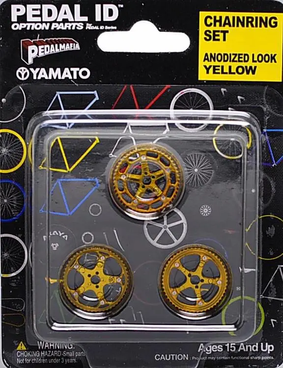 Customize your wheels! This Pedal ID Set allows you to customize your 1:9 scale model bicycle in a style that’s uniquely you and one of a kind. Mix and match components! This set includes x3 different style Anodized Look Yellow chain rings. PVC/ABS plastic construction. Blister card packaging.